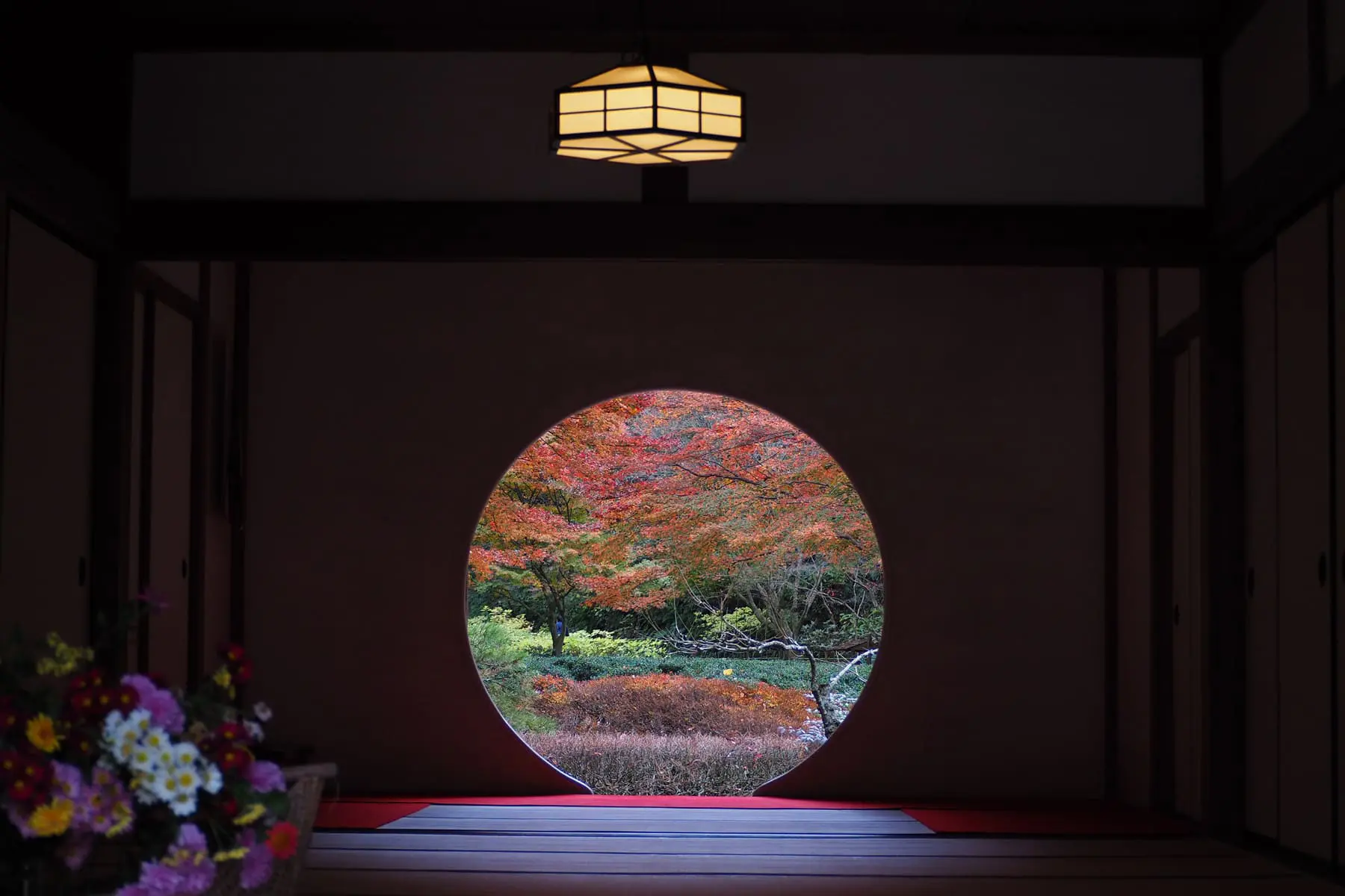 「あじさい寺」として有名な明月院は、紅葉の時期も圧巻。特に注目したいのは、秋の紅葉シーズンとハナショウブの時期だけ特別公開される 「本堂後庭園」。丸窓の向こうに広がる紅葉は、まるで絵画のような世界です。北鎌倉で静かに秋を味わいたい人にぴったりのスポットです。