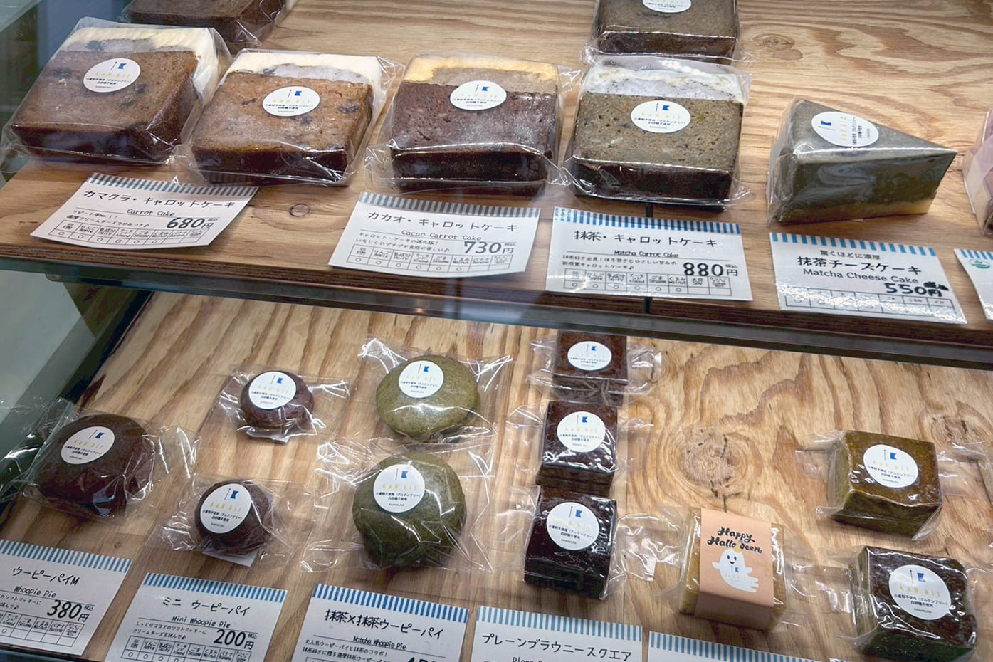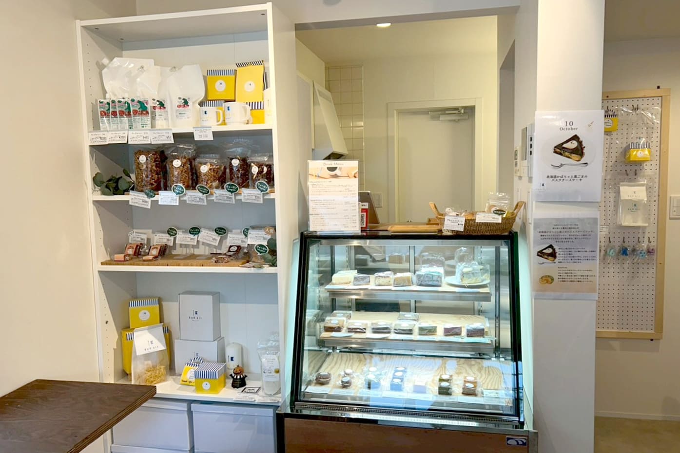 店内は、派手さはないけれど落ち着いた雰囲気。棚には焼き菓子が、冷蔵ショーケースにはケーキたちが、それぞれお行儀よく並んでいます。静かで清潔な空気のなかに、ひとつひとつのお菓子に対する丁寧な仕事ぶりが感じられます。