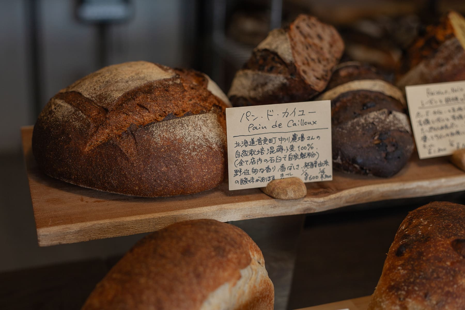 おすすめは看板のパン・ド・カイユー。全粒粉100%の田舎パンで、ホールは税込1,200円、ハーフは600円(※取材時の価格)。