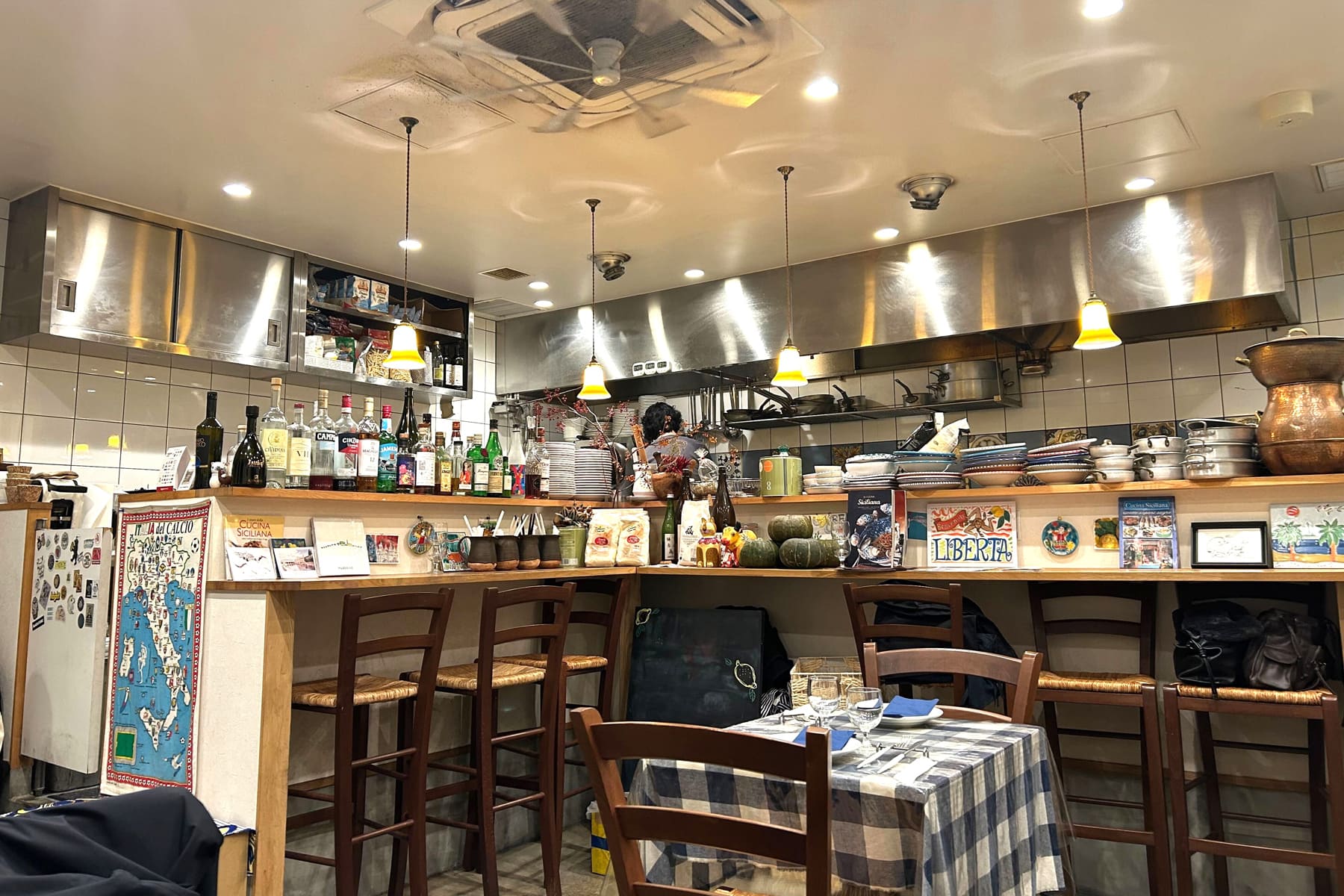 青いギンガムチェックのテーブルクロス、壁に掛けられたイタリアの地図、カラフルな雑貨たち─。明るくてどこか陽気で、イタリアの空気がふっと流れ込んでくるような、そんな雰囲気に包まれます。