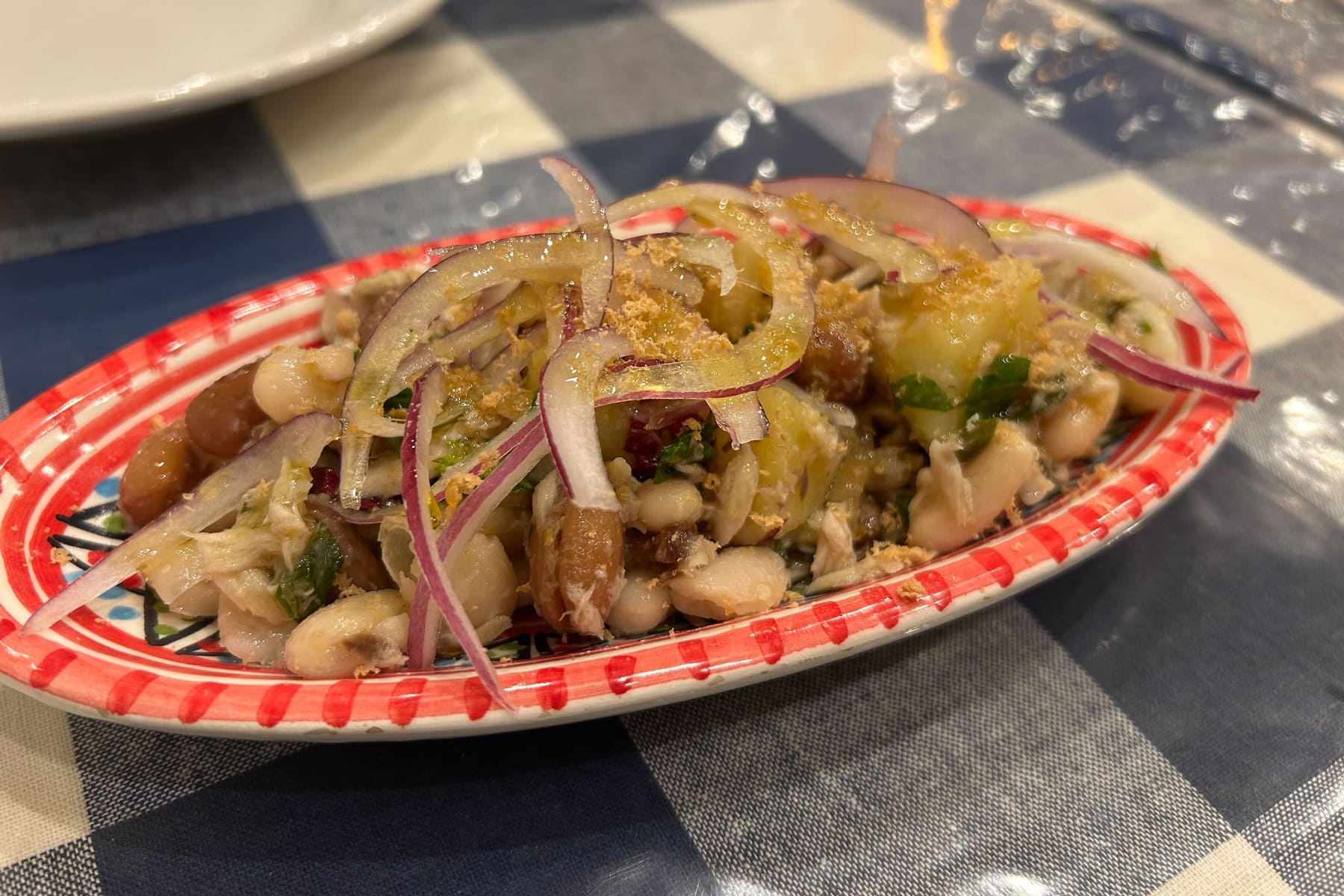 メジマグロに三崎本マグロのからすみ、イタリア産白いんげん豆、うずら豆、キヌア、玉ねぎなどを和えた、食感も香りも楽しい一品。さっぱりしているのに、ひと口ごとに違う表情がある、印象的な前菜です。
